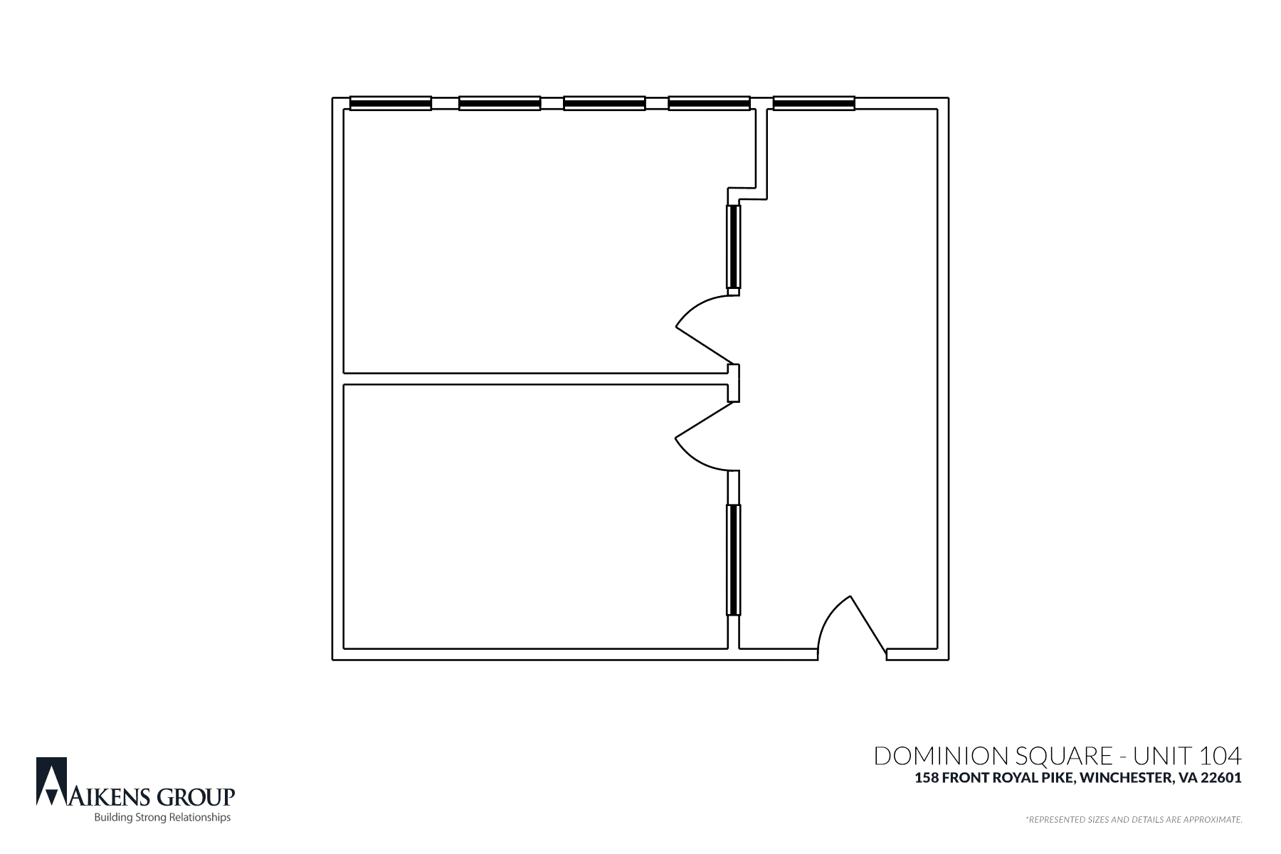 Unit 104 at Dominion Square is 425 square feet. This commercial real estate unit is located on the first floor and has a reception area with 2 offices.