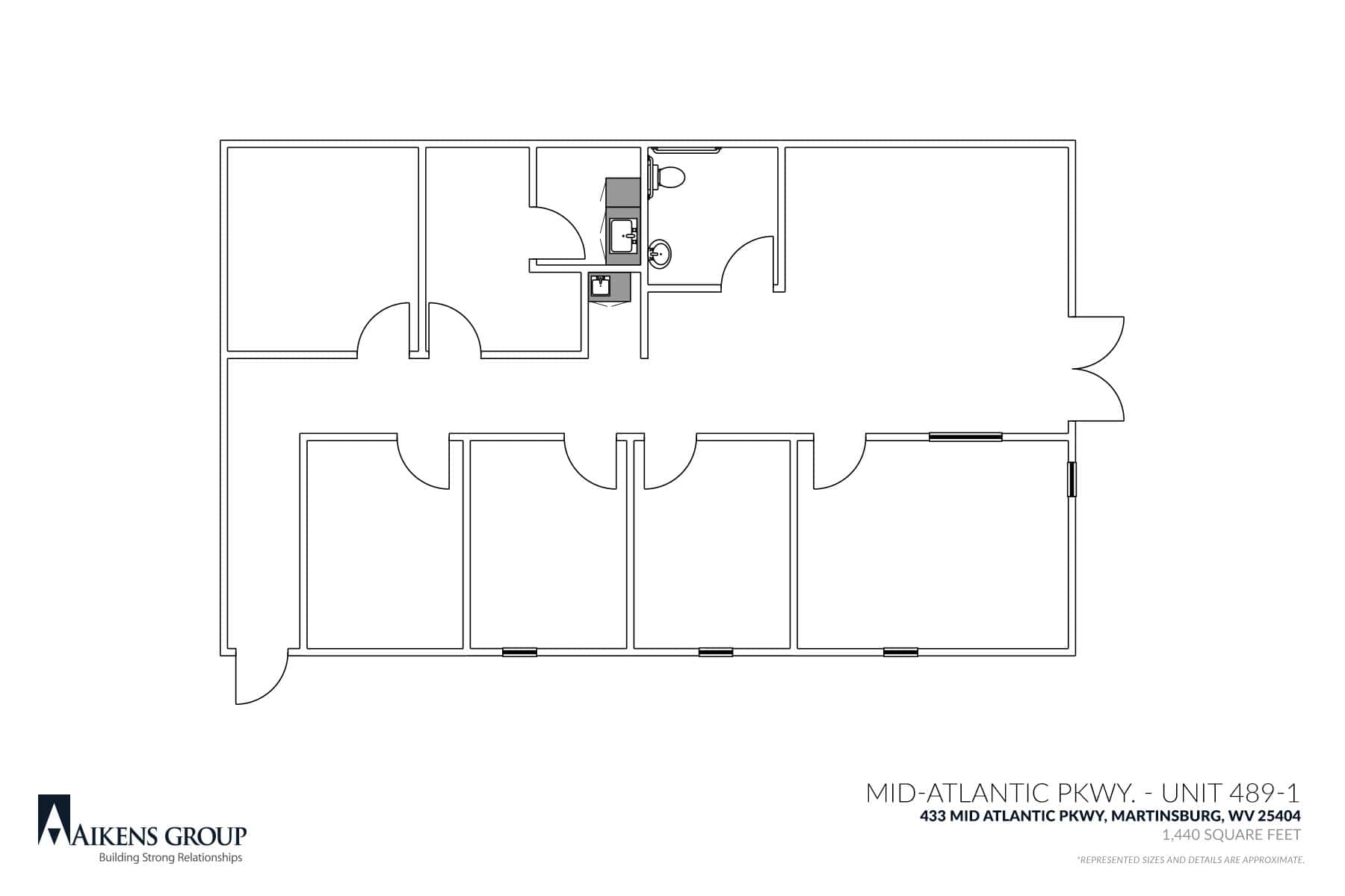 Offering over 1,400 sq ft of professional commercial real estate office space this unit is equipped with a front entrance room/reception window, individual offices, private bathrooms, and high traffic visibility. Mid-Atlantic parkway is a commercial real estate business center that consists of many different professional and retail businesses. Located a short distance from Edwin Miller Boulevard and Aikens Center Business Park this complex offers over 50,000 square feet of leasing space.