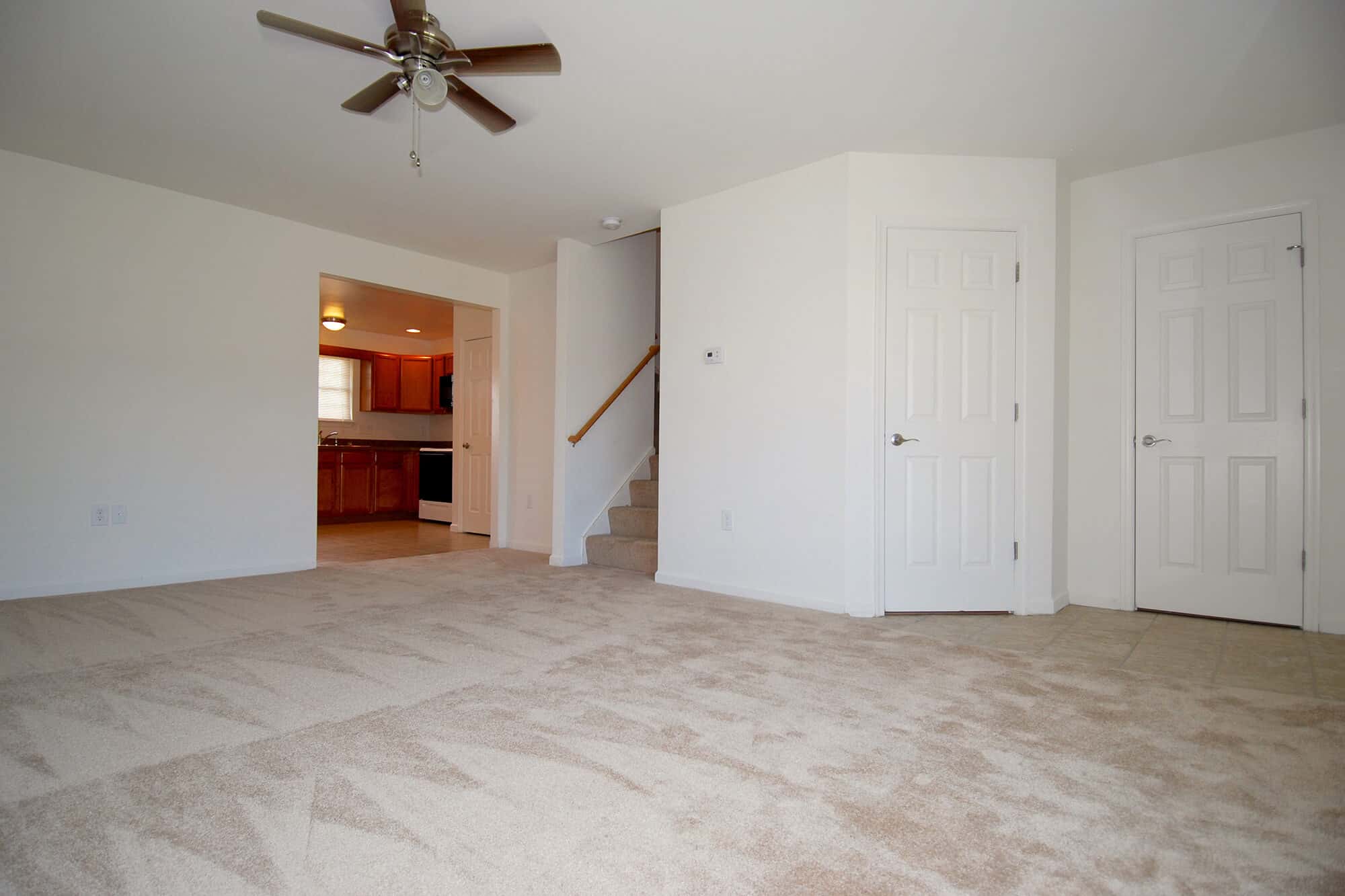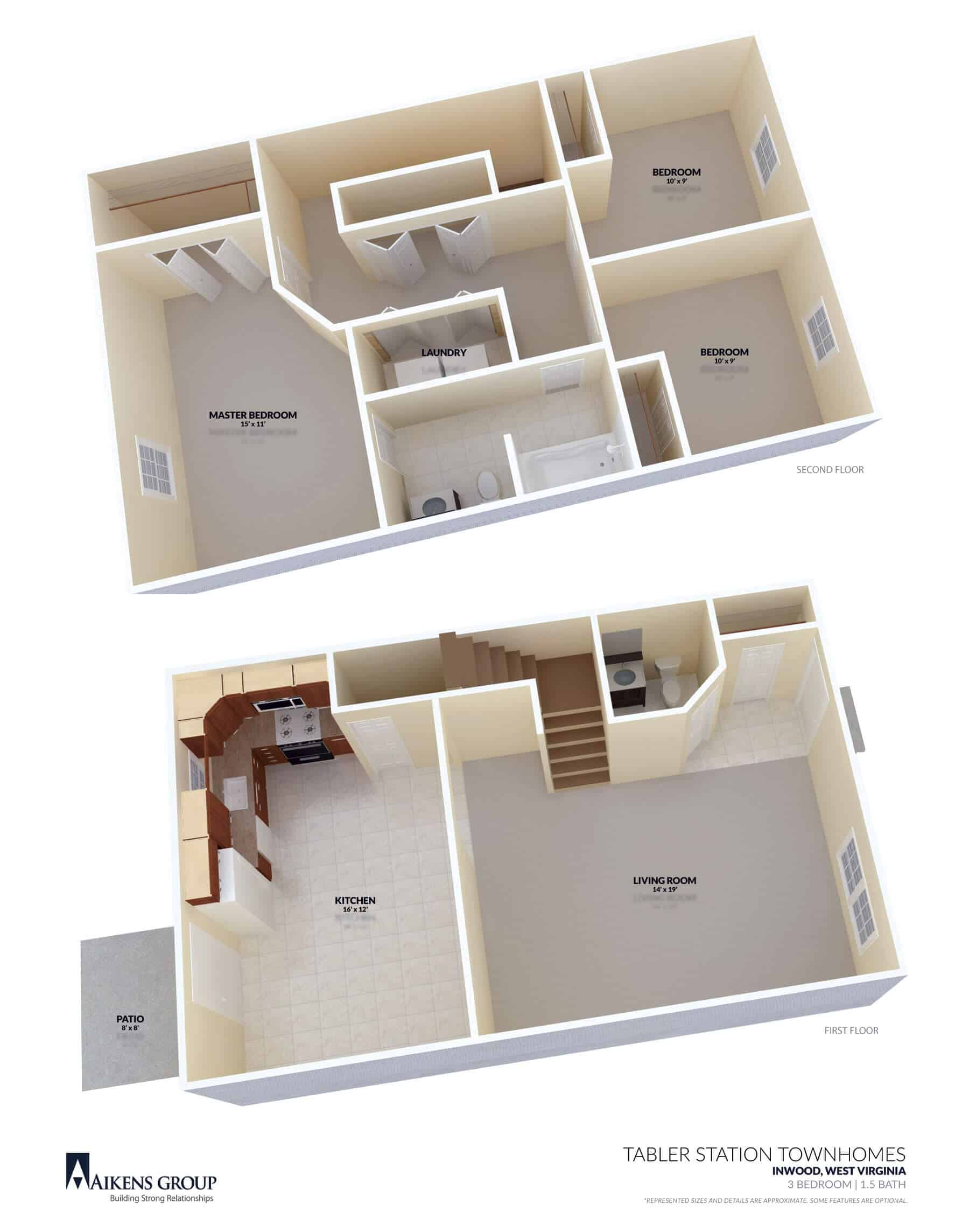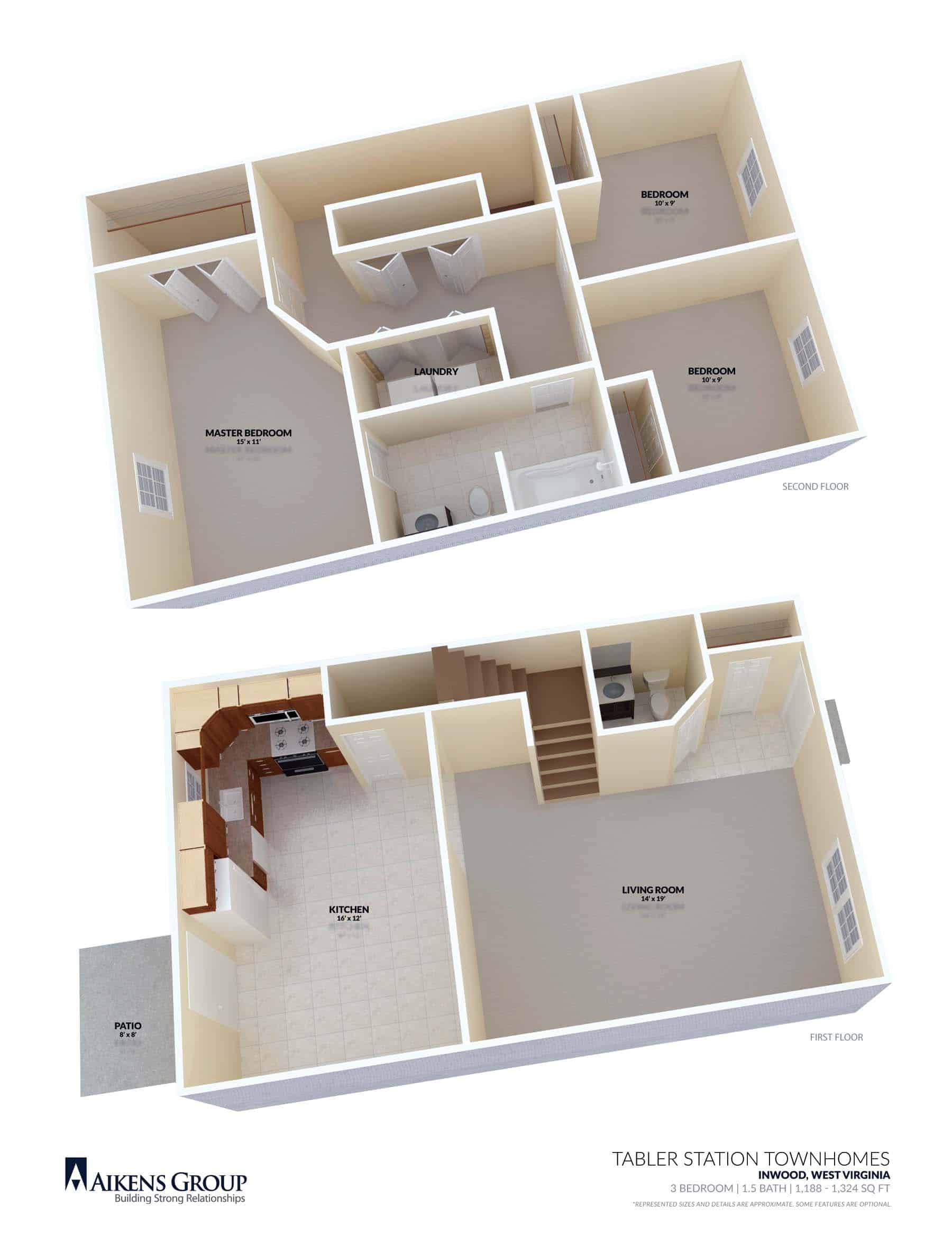 Our attractive townhouses offer three bedrooms and one and one half baths. These beautiful homes range in size from 1188 to 1324 square feet and each unit contains all kitchen appliances, a full size washer and dryer, and high speed internet access. Each of the units have a large eat in kitchen with lots of cabinets and counter space. Your home can be easily decorated with the plush, neutral carpet. And you can rest easy with the central air conditioning and lawn maintenance. The homes are built with energy efficiency in mind, making your utility bills very affordable.